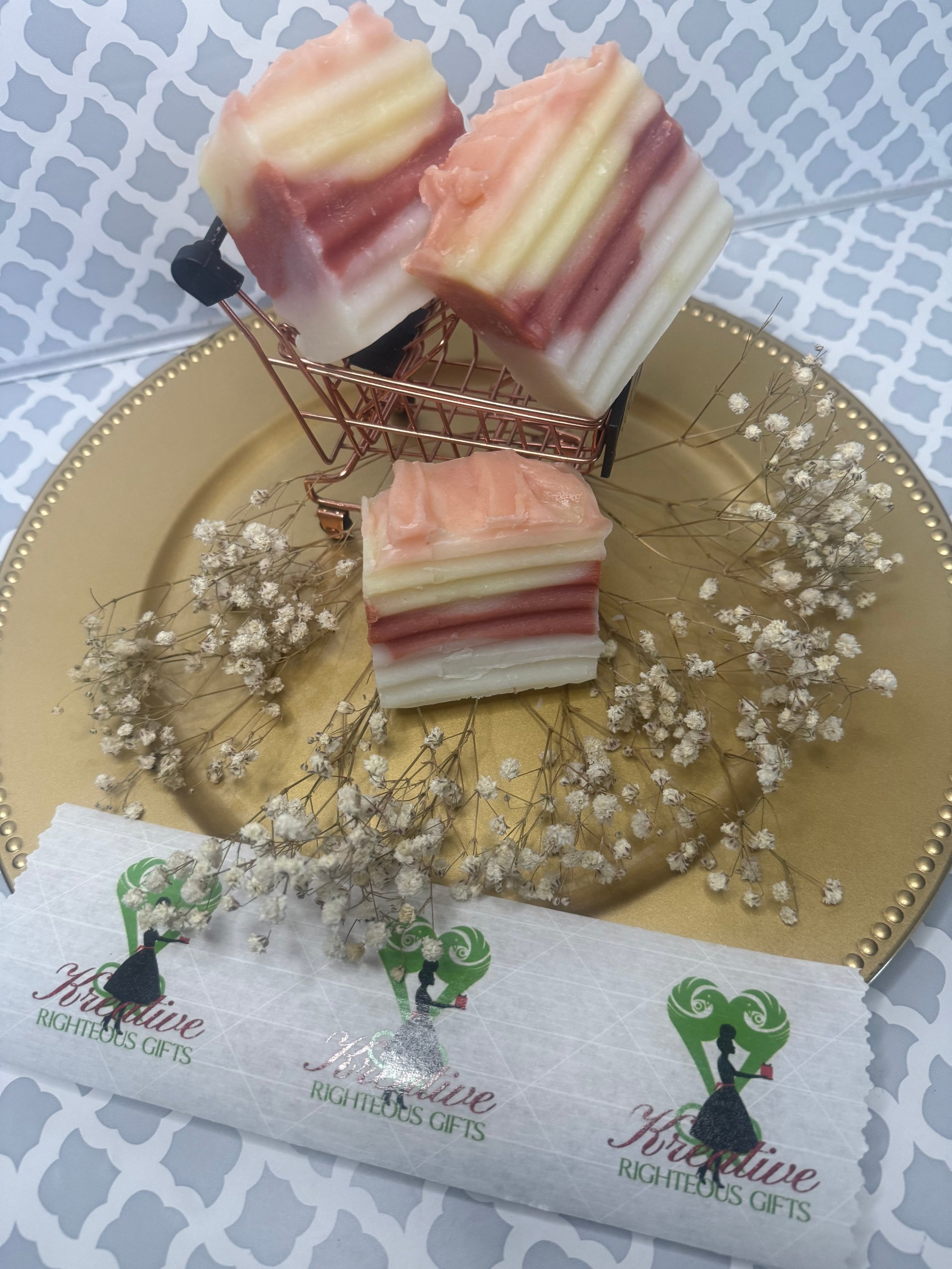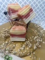 Ingredients: Sunflower Oil, Coconut Oil, Aloe Vera Juice, Distilled H2O, Sodium Hydroxide (lye), Shea Butter, Mango Butter, Cocoa Butter, Castor Oil, Passionfruit & Guava fragrance oil, Lemon Sherbet mica, Coral mica & Love!!!